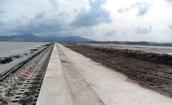 該段海堤長約781.1米,堤頂高程4.0米,設有防浪墻高程5.5米,斜坡坡度為1:1.5,于2011年完工驗收投入使用。