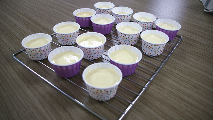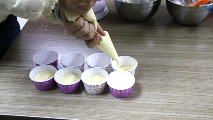 將做好的蛋糕液細(xì)心地裱入紙杯中,