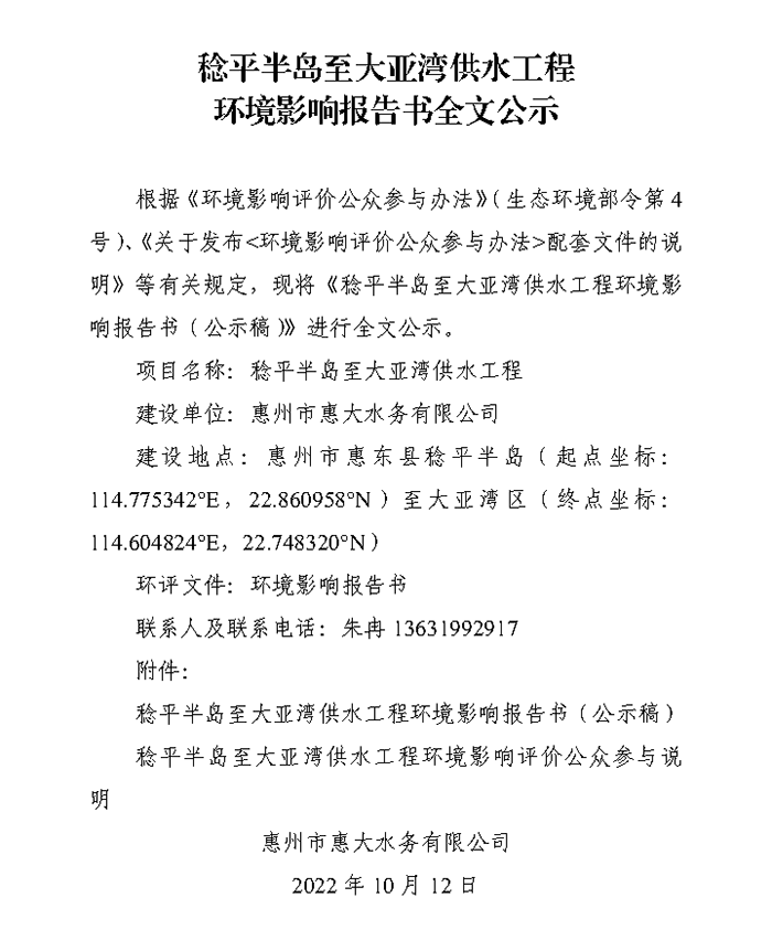 稔平半島至大亞灣供水工程環(huán)境影響評(píng)價(jià)公眾參與說(shuō)明
