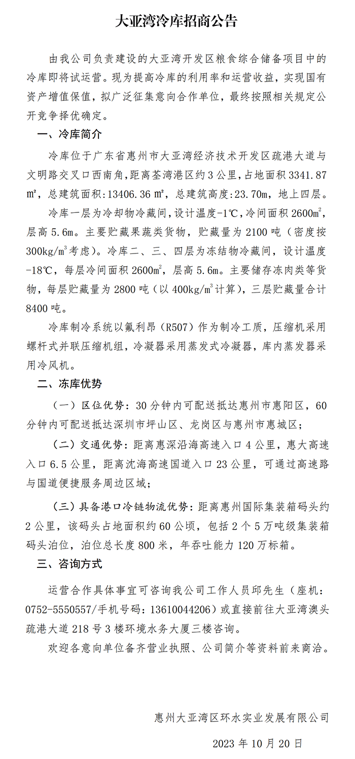 大亞灣冷庫招商公告