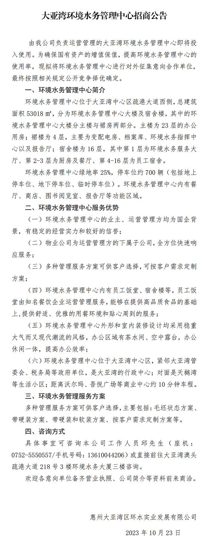 大亞灣環(huán)境水務(wù)管理中心招商公告